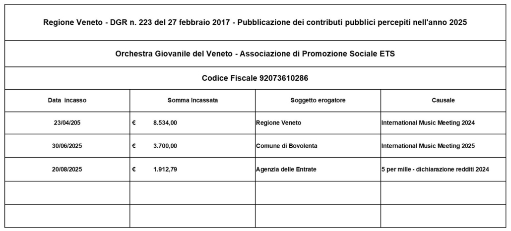 Regione Veneto -DGR n. 223 del 27 febbraio 2017 contributi pubblici ricevuti nel 2025 dall’Associazione di Promozione Sociale Orchestra Giovanile del Veneto